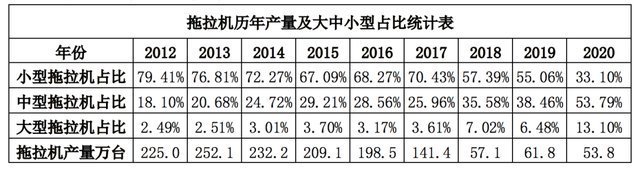 例如:2019年小拖拉机产量占比55.1%,2018年小拖拉机产量占比57.4%,2017年小拖拉机产量占比70.4%,产量占比2016年小型拖拉机占比68.3%。到2020年底,小拖拉机占比超过50%的局面有所改变,实现了转折。拖拉机产量由小到中大转变,实现国产拖拉机从小到大的结构。转型升级。根据国家统计局公布的数据,2020年全国拖拉机产量53.76万辆,其中小型拖拉机产量17.79万辆,占比大幅下降至33.1%,小拖拉机占比较低首次超过50%;中型拖拉机产量28.92万台,占比53.8%,中型拖拉机占比首次超过50%;大型拖拉机生产7.04万辆,占比13.1%,大型拖拉机占比首次超过10%。